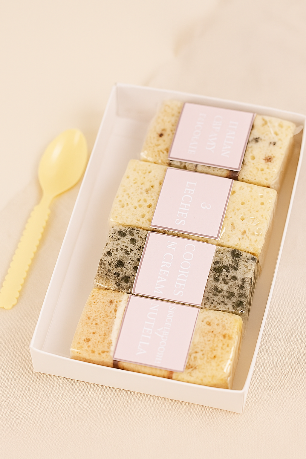 Now the most delicious part of this process! We will elaborate a cake testing box with your choice of 4 flavors and 4 fillings. These flavors can be chosen in advance from our menu.